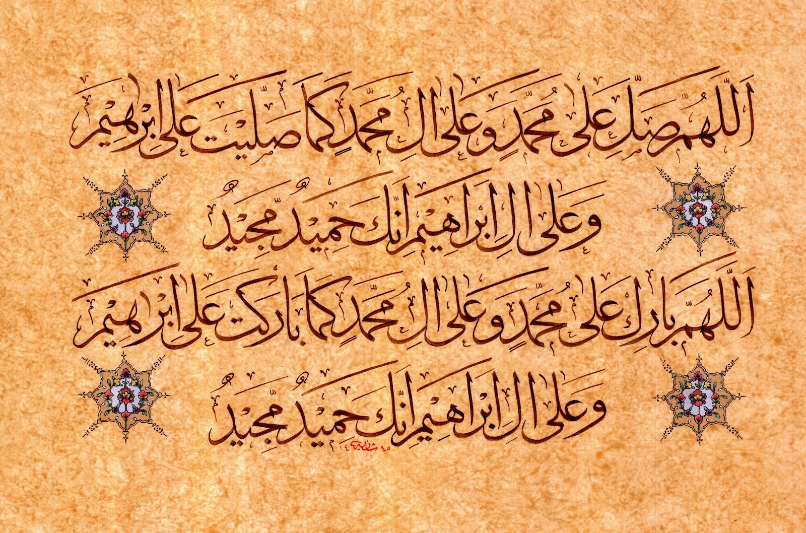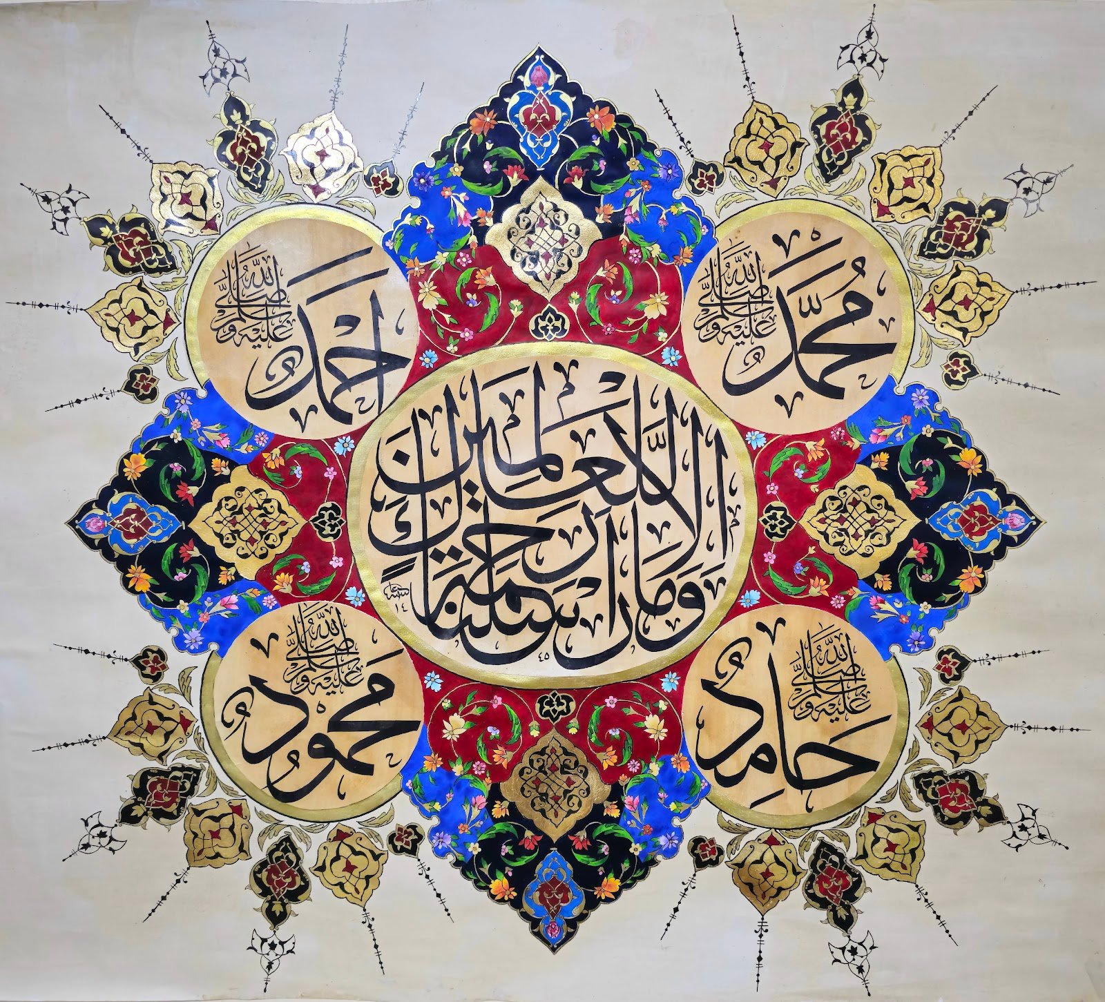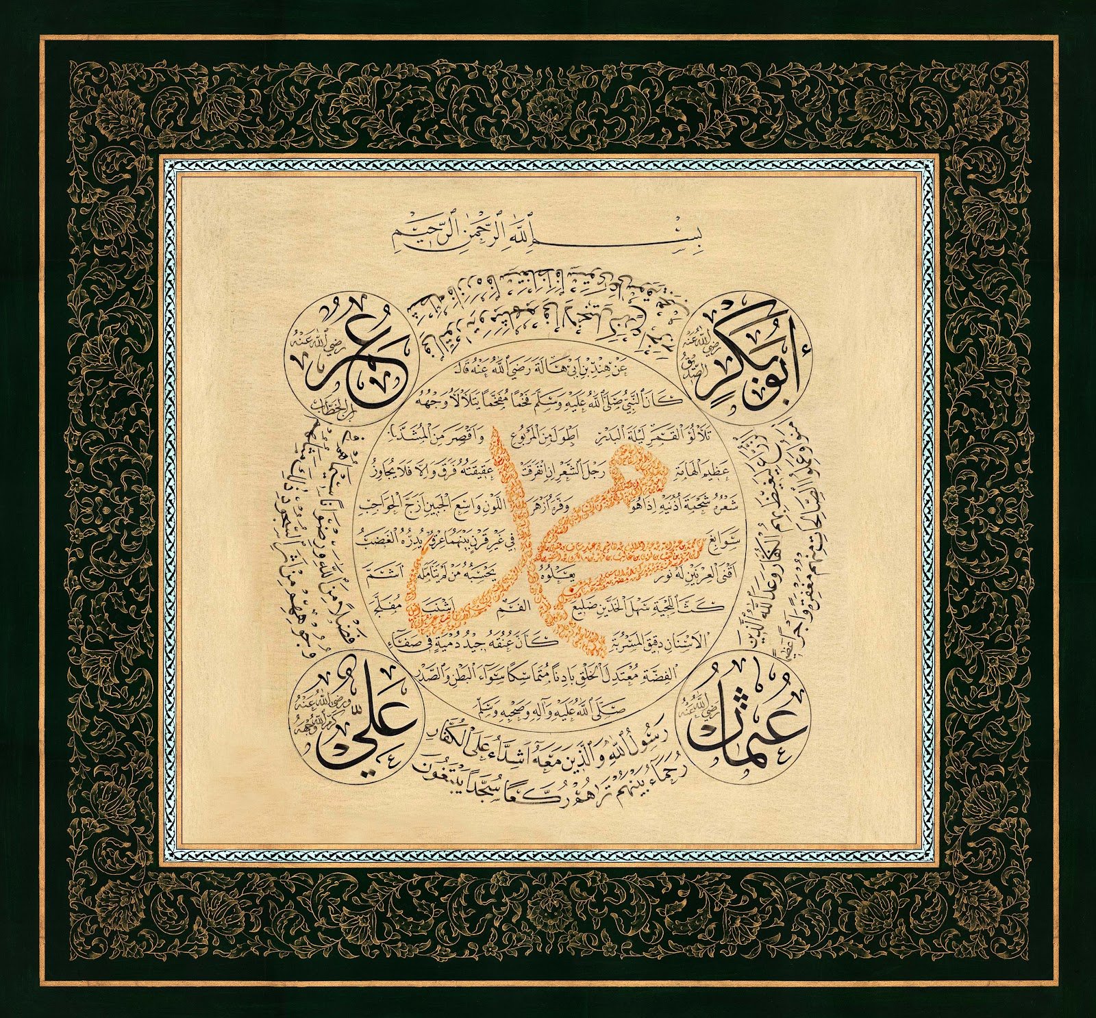 Description: A bright and illuminating piece like the luminous character of the Prophet PBUH. This piece brings a soothing, refreshing feeling to the heart. The Hilye in Tuluth script is surrounded by the names of the four Caliphs and there is heavy illumination all around.