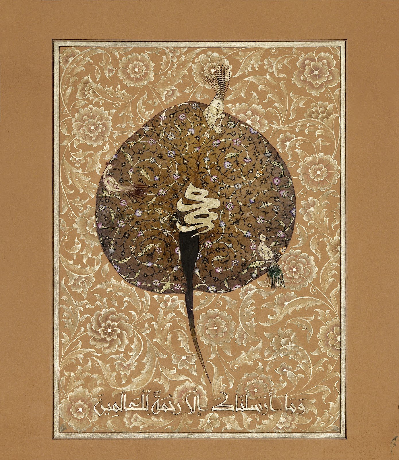 Description: Quranic verses in the middle circle praising the Prophet “Indeed We have sent you as a witness and a bearer of good tidings for the believers and a warner, a caller to God by His permission and an illuminating lamp.”