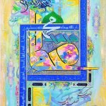 The central part is composed of Salaam on Prophet Mohammed (saw), which is bordered by Prophet Mohammed’s (PBUH) Name, i.e., ‘Mohammed and Ahmed.’ The names are composed to form a tessellation and create a geometric border around the central calligraphy piece. Further, the name Mohammed is mirrored vertically and horizontally at four corners & to complete the work, the top and bottom portions are adorned with Salawaat. I have tried to incorporate principles of Islamic geometry in the work using square kufi script. The color palette, too, is inspired by Masjid u Nabavi.