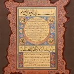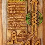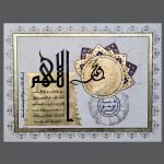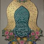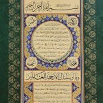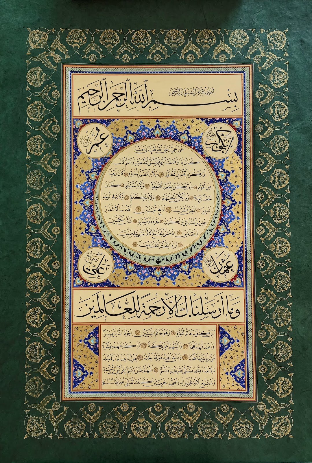 In Kufic calligraphy, there is a square/rectangular structure. The geometric linear style of Kufic script gives it a strong and dignified appearance. The use of green and golden colors around the center enhances its spiritual and royal impression. Features of Illumination (Tezhib) Around the center, there are Islamic floral decorative motifs (Arabesque / Islimi). Very fine craftsmanship is evident in the combination of green, reddish, and golden colors.