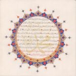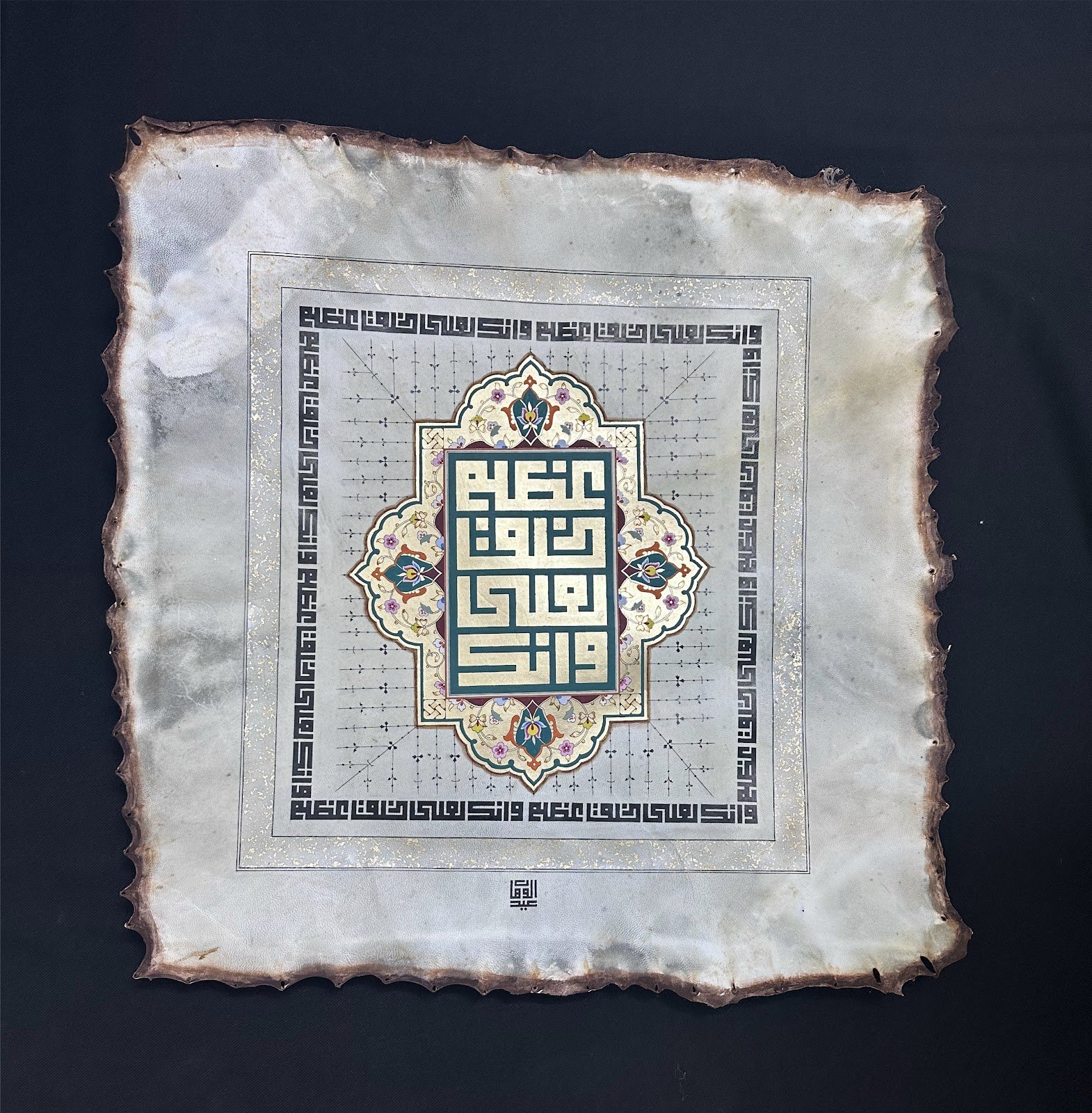 -The artwork is executed in a developed Fatimid Kufic script, accompanied by Andalusian Islamic geometric ornamentation.