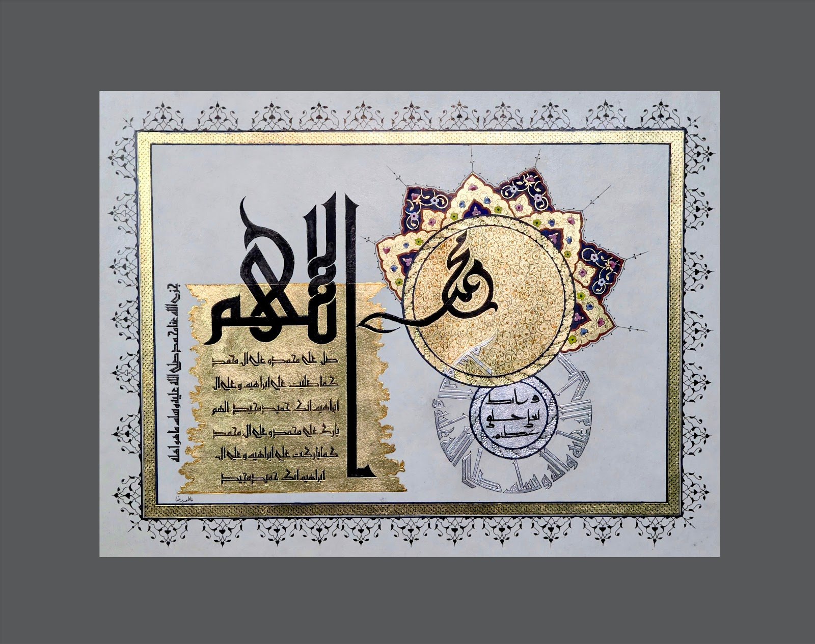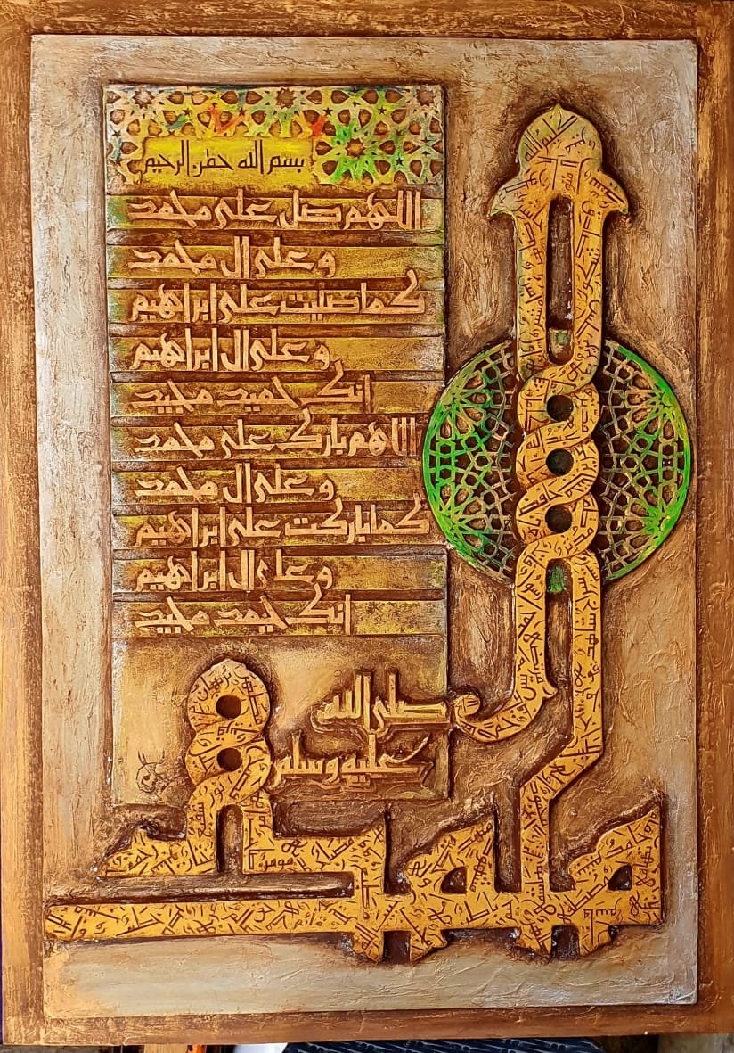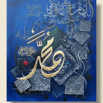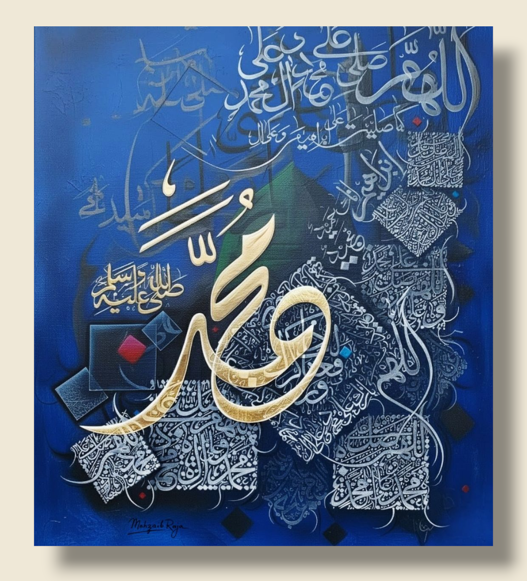 Spiritual Significance: In Islamic culture, an artwork like this is not just decoration; it serves as a Dhikir (remembrance). When a viewer looks at this piece, they are intended to recite the Salawat (“Allahumma salli ‘ala Muhammad”), fulfilling the command written in the center.