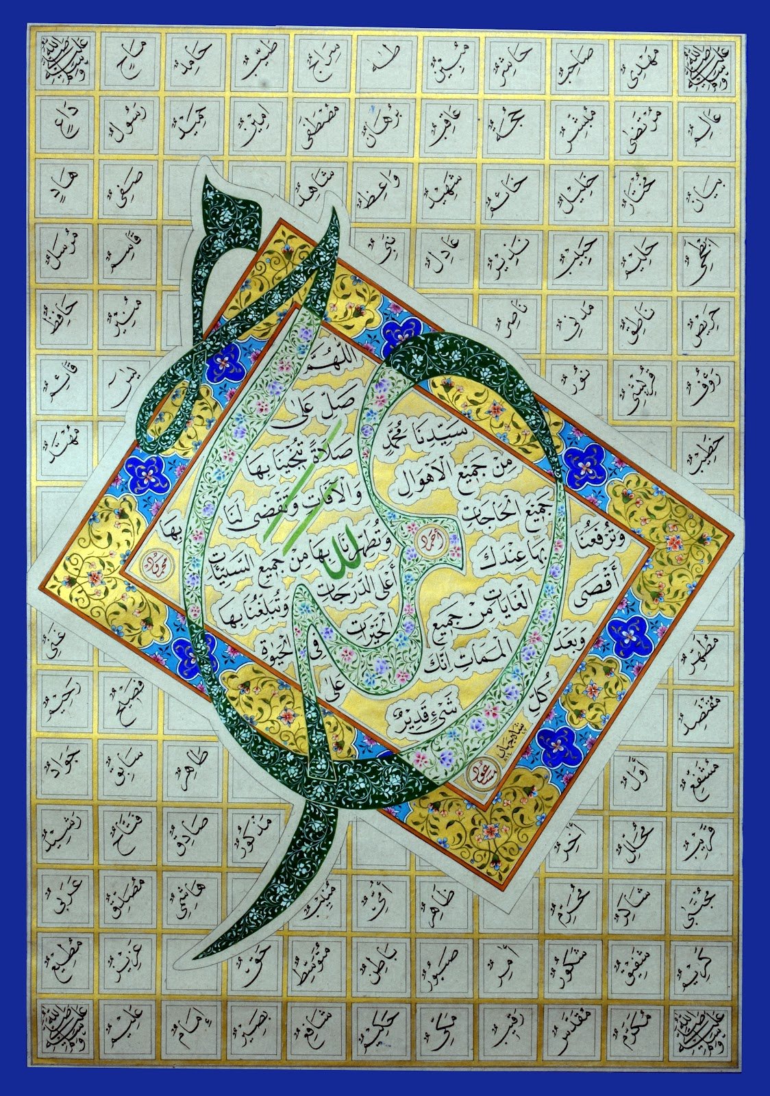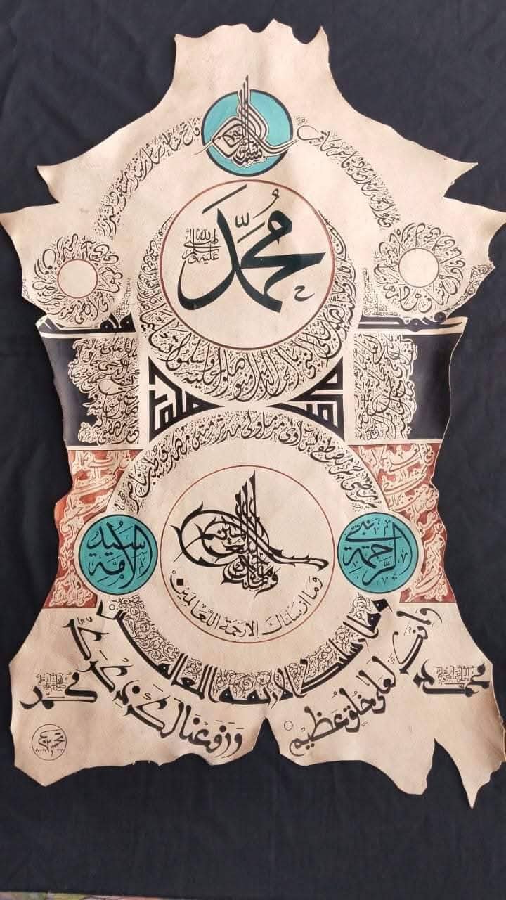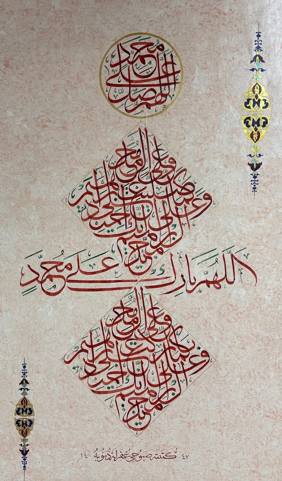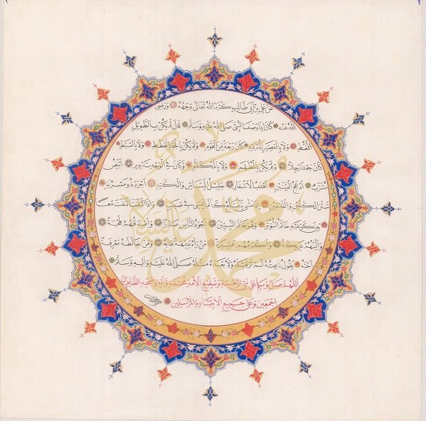 Spiritual Significance: In Islamic culture, an artwork like this is not just decoration; it serves as a Dhikir (remembrance). When a viewer looks at this piece, they are intended to recite the Salawat (“Allahumma salli ‘ala Muhammad”), fulfilling the command written in the center.