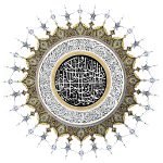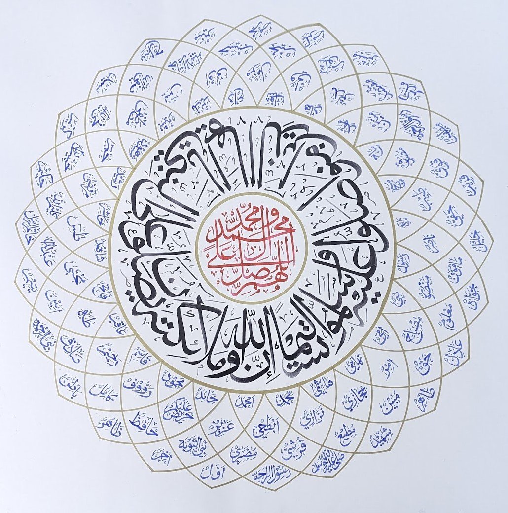 Calligraphy Style: The central script is Thuluth, known for its elegant, interconnected letters and upright structure. The outer white ring features a form of Diwani jali script, often used for supplications (du’a) or praises.