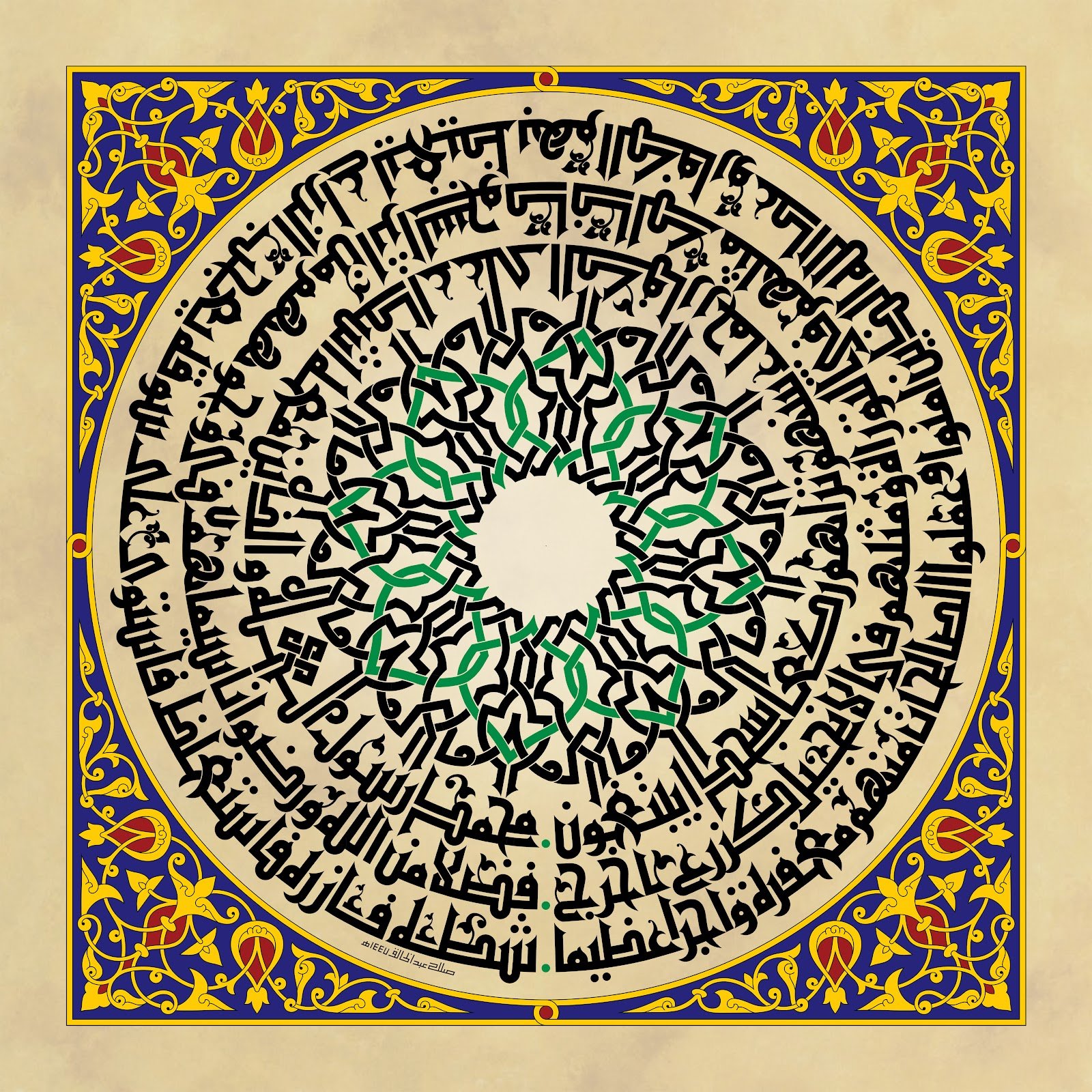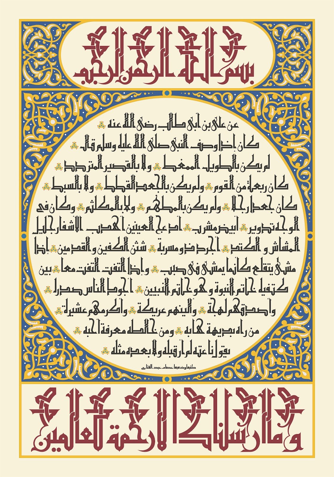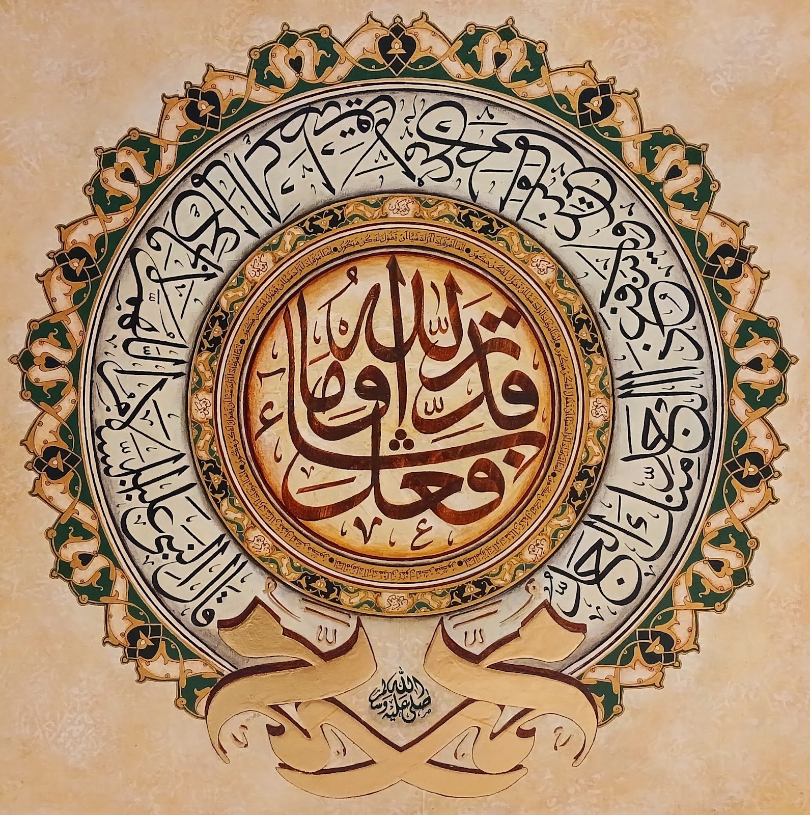 This artwork features a Qur’anic verse, specially chosen and written in recognition of the significance of the competition and its organizers. The piece presents Verse 29, the final verse of Surah Al-Fath: (مُحَمَّدٌ رَّسُولُ اللَّهِ ۚ وَالَّذِينَ مَعَهُ أَشِدَّاءُ عَلَى الْكُفَّارِ رُحَمَاءُ بَيْنَهُمْ ۖ تَرَاهُمْ رُكَّعًا سُجَّدًا يَبْتَغُونَ فَضْلًا مِّنَ اللَّهِ وَرِضْوَانًا ۖ سِيمَاهُمْ فِي وُجُوهِهِم مِّنْ أَثَرِ السُّجُودِ ۚ ذَٰلِكَ مَثَلُهُمْ فِي التَّوْرَاةِ ۚ وَمَثَلُهُمْ فِي الْإِنجِيلِ كَزَرْعٍ أَخْرَجَ شَطْأَهُ فَآزَرَهُ فَاسْتَغْلَظَ فَاسْتَوَىٰ عَلَىٰ سُوقِهِ يُعْجِبُ الزُّرَاعَ لِيَغِيظَ بِهِمُ الْكُفَّارَ ۗ وَعَدَ اللَّهُ الَّذِينَ آمَنُوا وَعَمِلُوا الصَّالِحَاتِ مِنْهُم مَّغْفِرَةً وَأَجْرًا عَظِيمًا)
