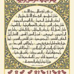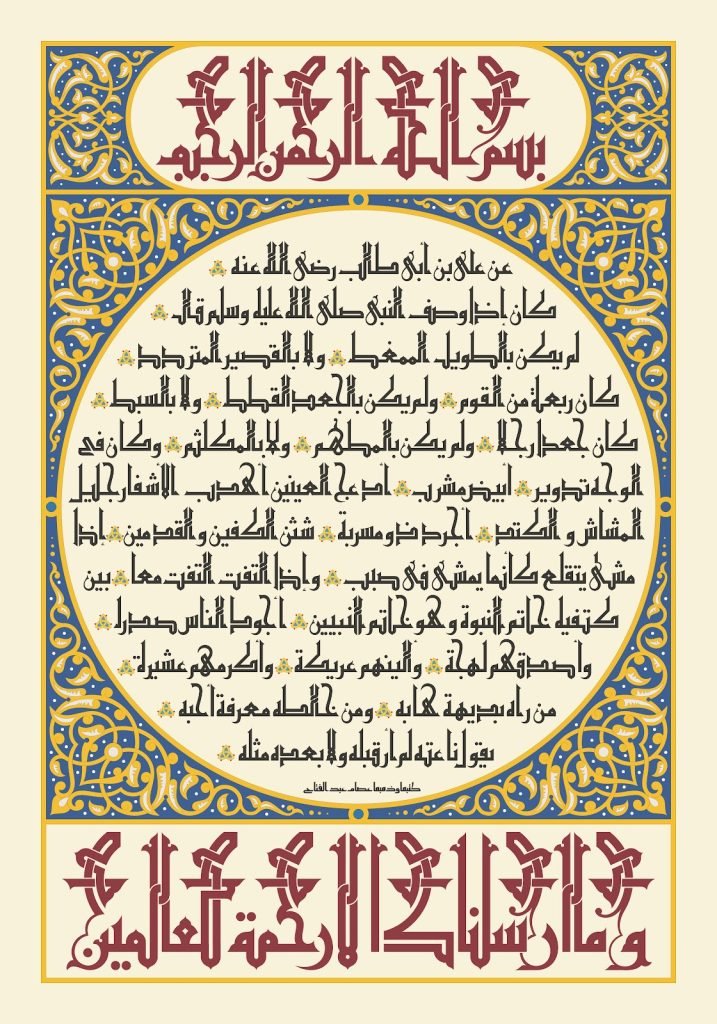 At the top of the plaque is written “In the name of God, the Most Gracious, the Most Merciful,” and at the bottom, “And We have not sent you except as a mercy to the worlds,” and in the middle of the plaque is a description of the noble Prophet. The traditional Hilye as below: